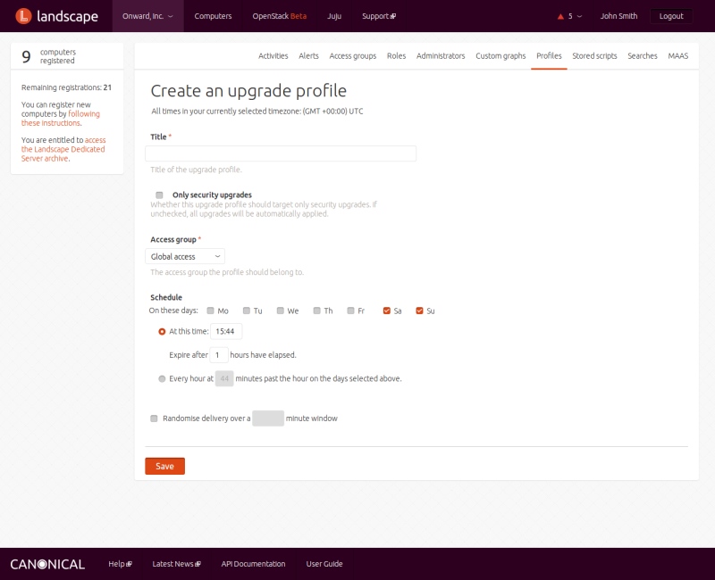 A removal profile defines a maximum number of days that a computer can go without exchanging data with the Landscape server before it is automatically removed. If more days pass than the profile's "Days without exchange", that computer will automatically be removed and the license seat it held will be released. This helps Landscape keep license seats open and ensure Landscape is not tracking stale or retired computer data for long periods of time. You can associate zero or more computers with each removal profile via tags to ensure those computers are governed by this removal profile. You can also associate a removal profile with an access group, which limits its use to only computers within the specified access group. You can manage removal profiles from the REMOVAL PROFILES link in the choice under your account.