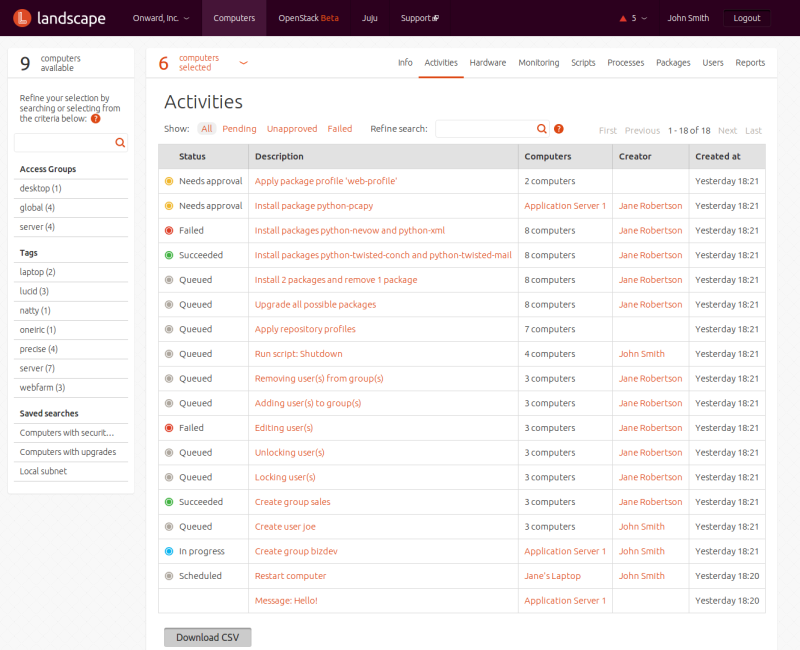 You can select one or more computers individually, or by using searches or tags. For each of those approaches, the starting place is the menu entry at the top of the screen. Clicking on it displays a list of all computers Landscape knows about.